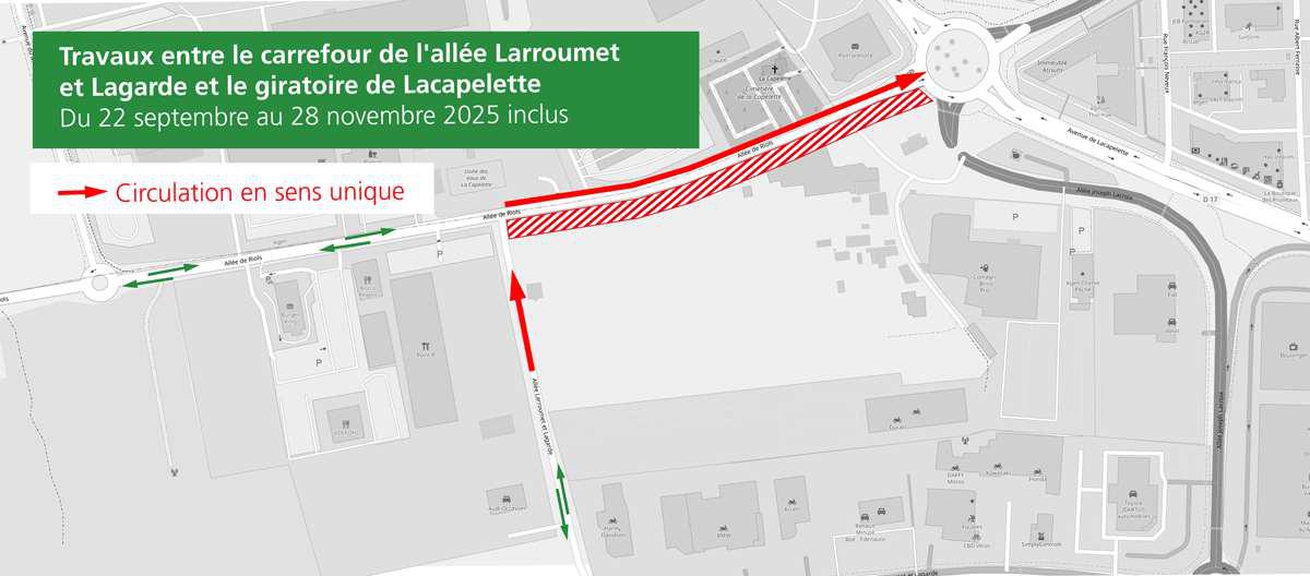 - Impact sur la circulation :Mise en sens unique de la circulation de Larroumet et Lagarde de la zone de retournement vers le carrefour de l'allée de Riols.