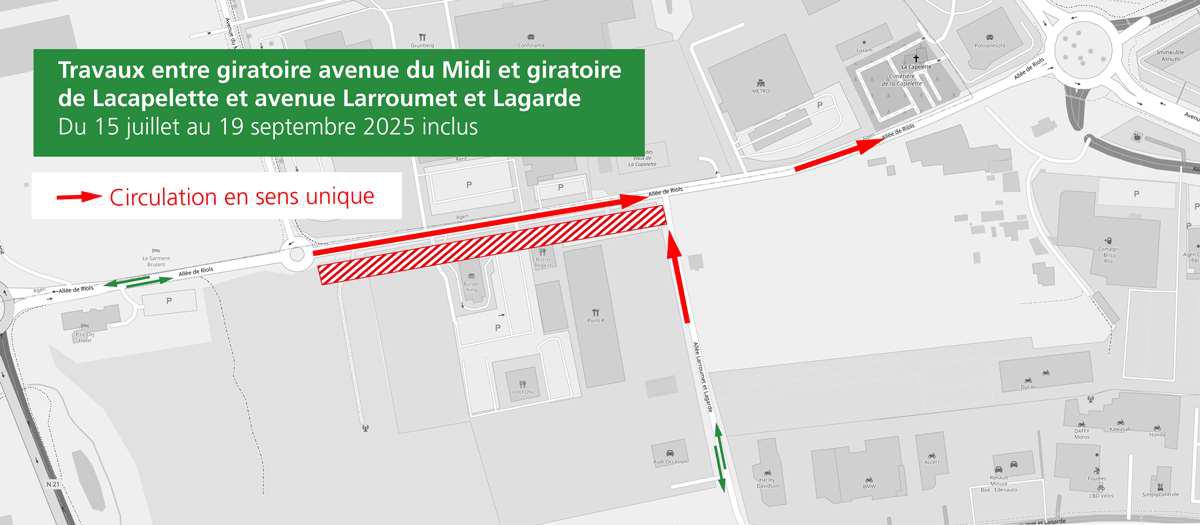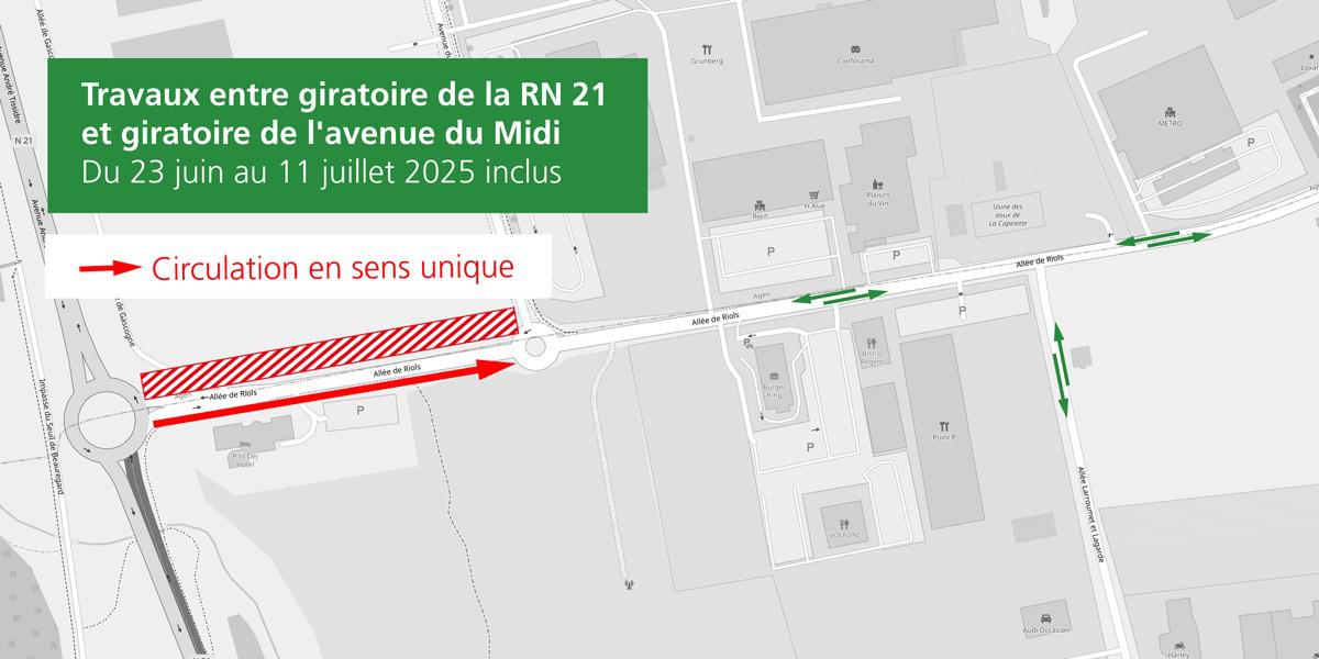 - Impact sur la circulation : Mise en sens unique de circulation sur l'allée de Riols, du rond-point de la RN 21 vers le rond-point de l'avenue du Midi