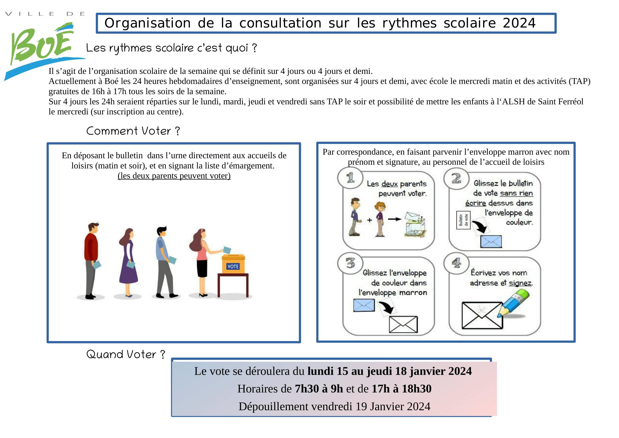 Cette consultation sera organisée sur la semaine du 15 au 18 janvier 2024 sur les accueils de loisirs avec la possibilité de transmettre son bulletin par correspondance.