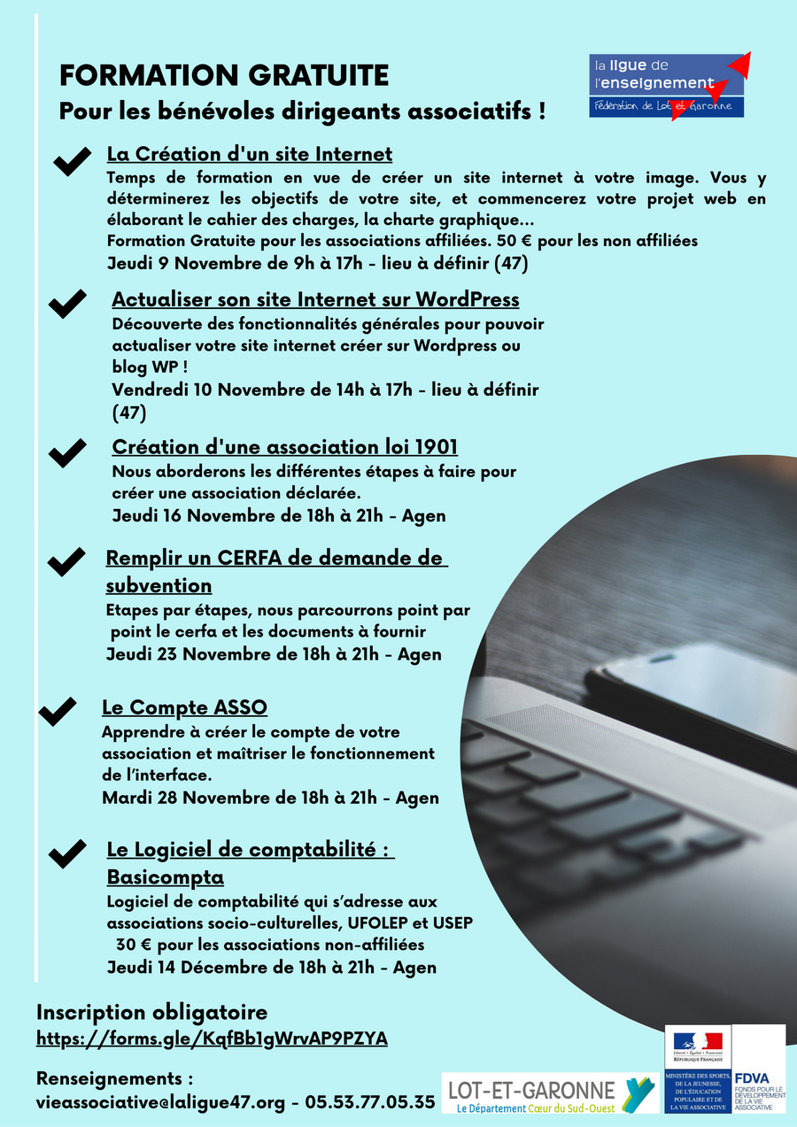 Ces formations sont GRATUITES. Elles se déroulent à différents endroits du département : Duras, Fumel, Agen, Casteljaloux… ou en visio le cas échéant et portent sur plusieurs thématiques : « Les fondamentaux du fonctionnement associatif », « informatiser sa comptabilité avec le logiciel Basicompta », "Création d'un site internet", "Créer une association", "Le compte asso" ...