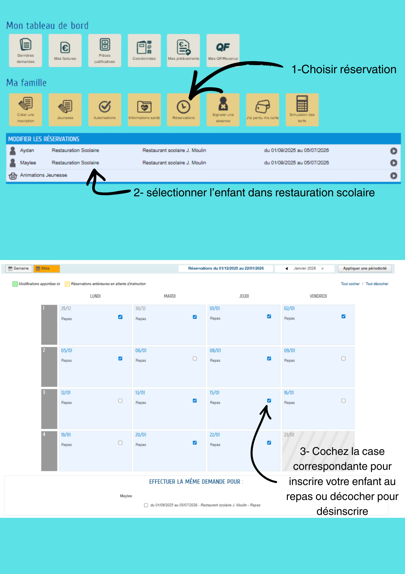 La réservation se fera directement depuis votre Espace Famille, via l’onglet « Réservation ».