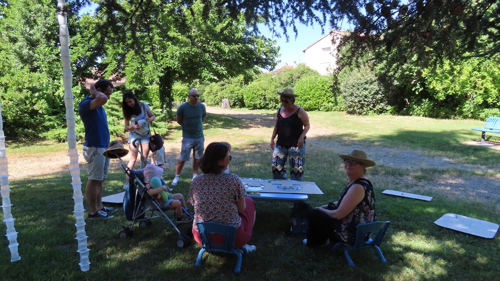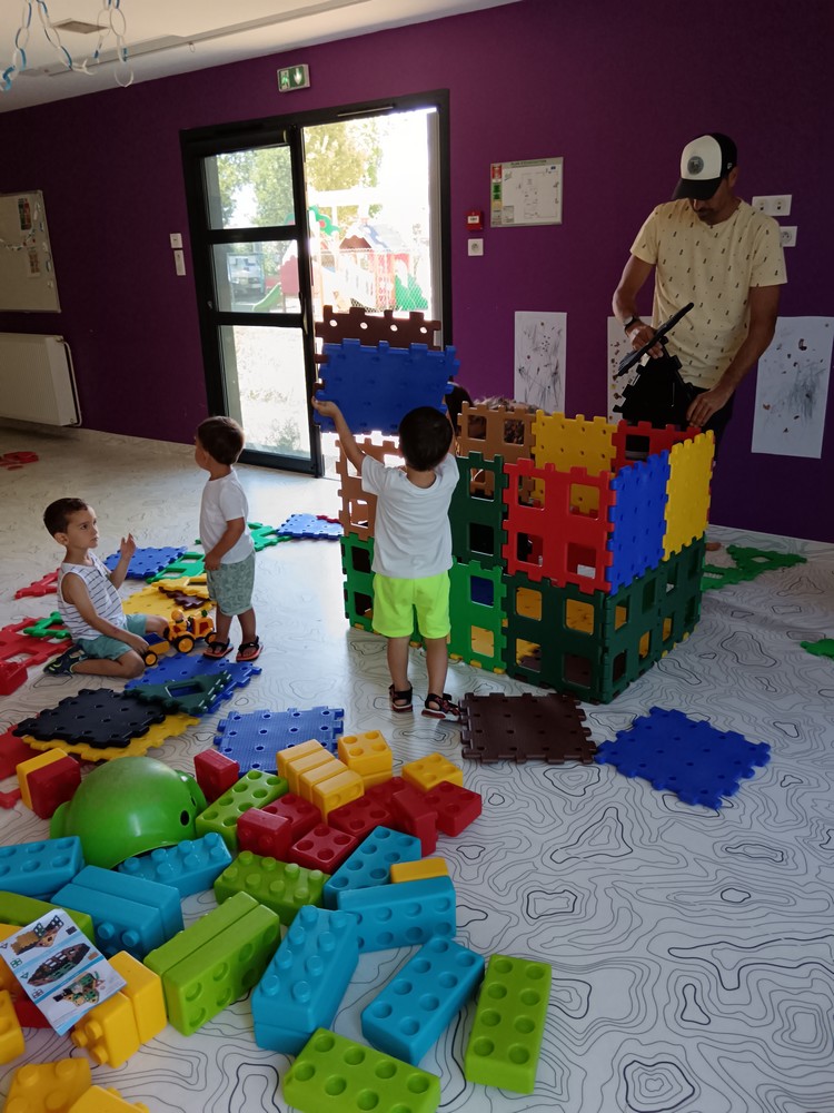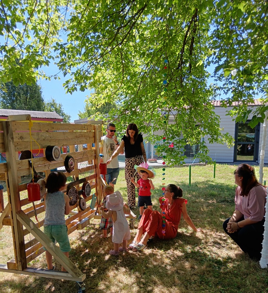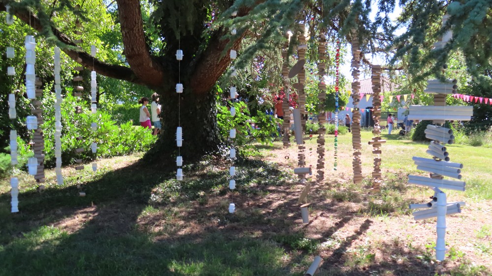 Les enfants sont partis à la découverte d'une cabane, d'un circuit de voitures, d'une cage de foot, d'un très surprenant support musical ; le tout fabriqué en palette de bois ; d'un tipi et d'un parcours sensoriel en bois ainsi que de multiples mobiles en cartons, bouchons et tissus.
