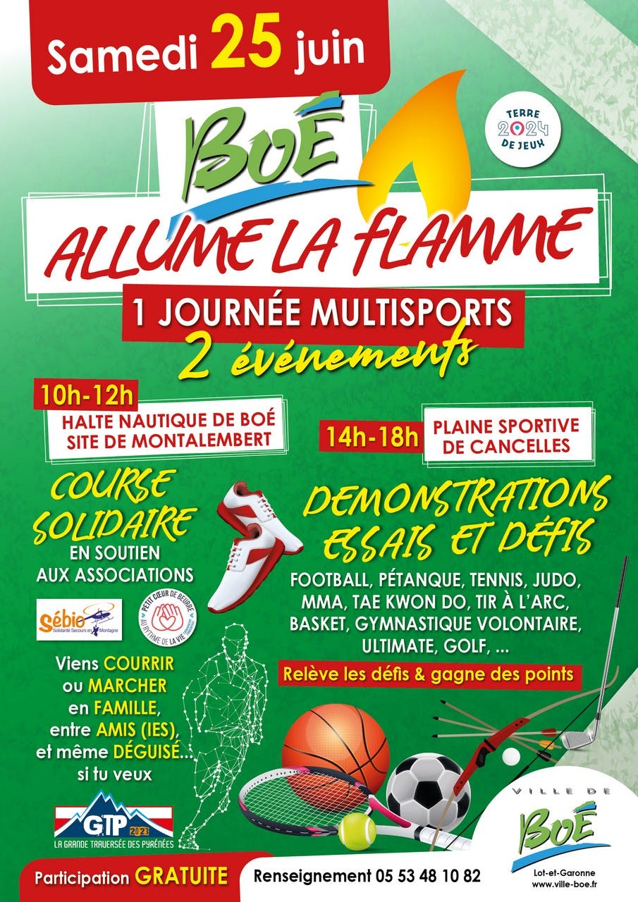 Le matin c'est une course à pied solidaire à Montalembert en lien avec la Grande Traversée des Pyrénées effectuée en 2023 par Frédéric Burgot, boétien. L'après-midi c'est la plaine de Cancelles qui s'animera avec des démonstrations, la possibilité d'essayer chaque sport sur un seul site. Le football, la pétanque, le tennis, le judo, la gymnastique volontaire, l'ultimate, le golf, le basket, tous les sports, toutes les associations vous attendent!