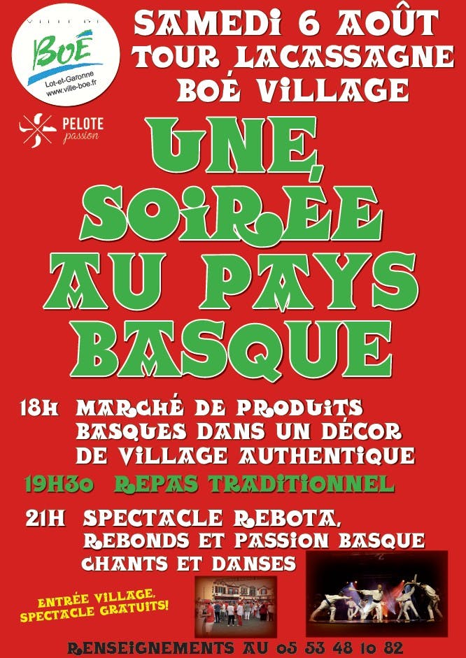 C'est l'événement à ne pas manquer cet été à Boé, la place devant la Tour Lacassagne va accueillir un village basque ! Dès 18H, un décor comme si vous y étiez, un marché de produits basques, des animations, puis, un repas typique animé.